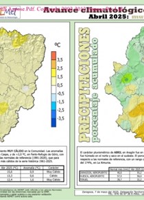 Abril, en general, tuvo un comportamiento muy cálido en Aragón. Las anomalías observadas oscilaron entre valores de +0,4 ºC, en Caspe, y de +2,0 ºC en Fanlo-Refugio de Góriz, con un promedio regional de +1,2 ºC con respecto a las normales de referencia (1991-2020), que para este mes son 10,8 ºC. Se coloca entre los más cálidos de la serie histórica 1961-2025.
