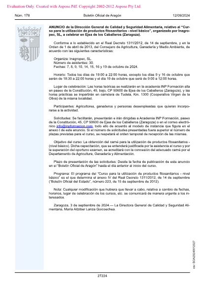 Solicitudes: Se facilitarán, presentarán e irán dirigidas a Academia INP Formación, paseo de la Constitución, 45, CP 50600 de Ejea de los Caballeros (Zaragoza) o en el correo electrónico [email protected], todo ello de acuerdo al modelo de instancia que figura en el anexo I de este anuncio. Si el número de solicitudes presentadas fuera superior al número de plazas previstas para el curso, se respetará el orden temporal de recepción de las mismas.