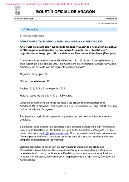 Lugar de celebración: las horas teóricas y las prácticas se realizarán en la Academia INP Formación, sita en paseo de la Constitución, 45, bajo, 50600 de Ejea de los Caballeros (Zaragoza).