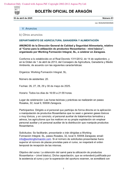 Solicitudes: Se facilitarán, presentarán e irán dirigidas a Working Formación Integral, SL, paseo Rosales, 32, local 9, 50008 Zaragoza; email: info@workingformación.com