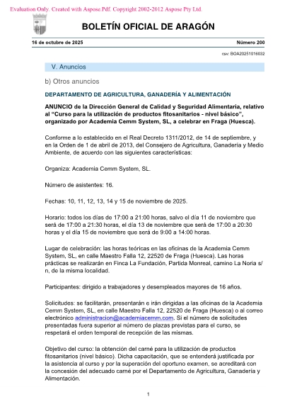 Solicitudes: se facilitarán, presentarán e irán dirigidas a las oficinas de la Academia Cemm System, SL, en calle Maestro Falla 12, 22520 de Fraga (Huesca) o al correo electrónico [email protected]