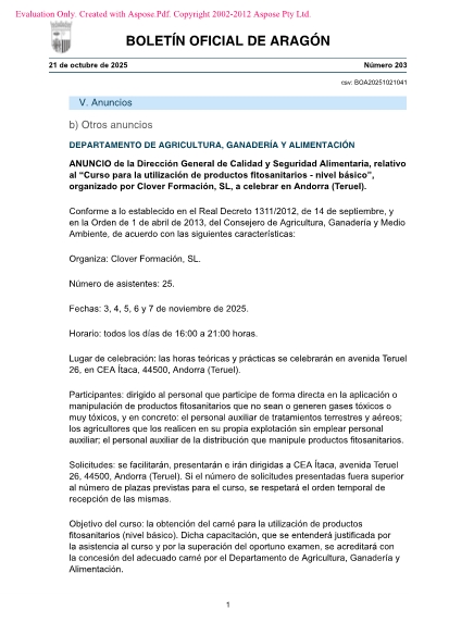 Formación Aparatos o maquinaria de aplicación Fitosanitarios de síntesis
