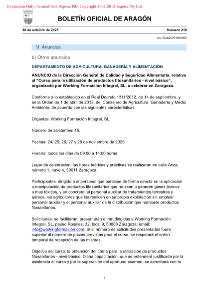 Solicitudes: se facilitarán, presentarán e irán dirigidas a Working Formación Integral, SL, paseo Rosales, 32, local 9, 50008 Zaragoza; email: info@workingformación.com
