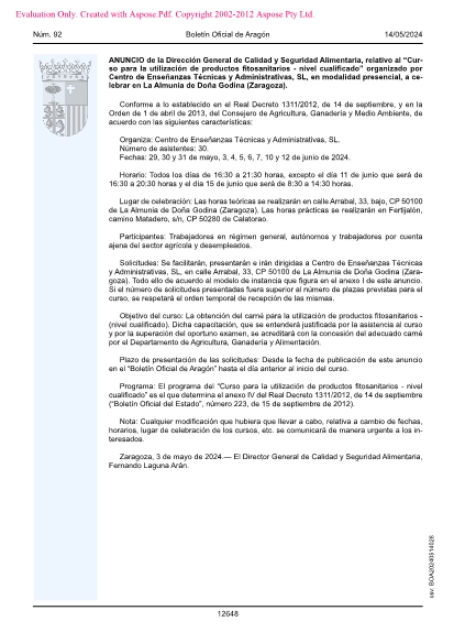 Solicitudes: Se facilitarán, presentarán e irán dirigidas a Centro de Enseñanzas Técnicas y Administrativas, SL, en calle Arrabal, 33, CP 50100 de La Almunia de Doña Godina (Zaragoza). Todo ello de acuerdo al modelo de instancia que figura en el anexo I de este anuncio. Si el número de solicitudes presentadas fuera superior al número de plazas previstas para el curso, se respetará el orden temporal de recepción de las mismas.