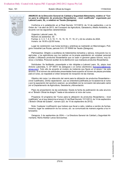 Solicitudes: Se facilitarán, presentarán e irán dirigidas a Laboral Learn, SL, plaza José Antonio Labordeta, 6, CP 50017 de Zaragoza o al correo electrónico ([email protected]). Todo ello de acuerdo al modelo de instancia que figura en el anexo I de este anuncio. Si el número de solicitudes presentadas fuera superior al número de plazas previstas para el curso, se respetará el orden temporal de recepción de las mismas.