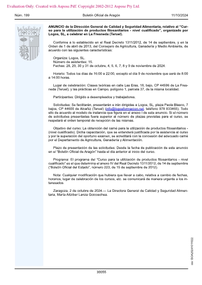 Solicitudes: Se facilitarán, presentarán e irán dirigidas a Logos, SL, plaza Paola Blasco, 7 bajos, CP 44600 de Alcañiz (Teruel) ([email protected], teléfono 978 833465). Todo ello de acuerdo al modelo de instancia que figura en el anexo I de este anuncio. Si el número de solicitudes presentadas fuera superior al número de plazas previstas para el curso, se respetará el orden temporal de recepción de las mismas.