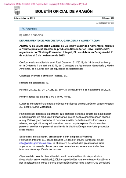 Solicitudes: se facilitarán, presentarán e irán dirigidas a Working Formación Integral, SL, paseo Rosales 32, local 9, 50008 Zaragoza; email: info@workingformación.com