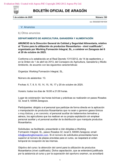 Solicitudes: se facilitarán, presentarán e irán dirigidas a Working Formación Integral, SL, paseo Rosales 32, local 9, 50008 Zaragoza; email: info@workingformación.com
