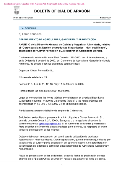 Lugar de celebración: las horas teóricas se celebrarán en avenida Bigas Luna 2, polígono industrial, 44200 de Calamocha (Teruel) y las horas prácticas en coordenadas 44-50-999-0-13-59002-34 de la misma localidad.