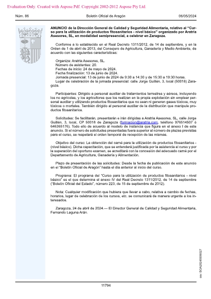 Solicitudes: Se facilitarán, presentarán e irán dirigidas a Aratria Asesores, SL, calle Jorge Guillén, 3, local, CP 50018 de Zaragoza ([email protected], teléfono 976514507 ó 646365176). Todo ello de acuerdo al modelo de instancia que figura en el anexo I de este anuncio. Si el número de solicitudes presentadas fuera superior al número de plazas previstas para el curso, se respetará el orden temporal de recepción de las mismas.