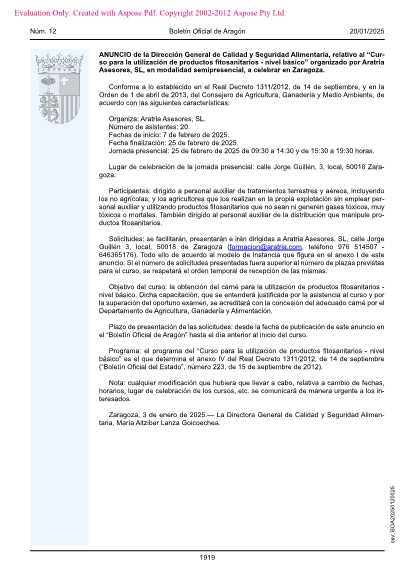 Solicitudes: se facilitarán, presentarán e irán dirigidas a Aratria Asesores, SL, calle Jorge Guillén 3, local, 50018 de Zaragoza ([email protected], teléfono 976 514507 - 646365176). Todo ello de acuerdo al modelo de instancia que figura en el anexo I de este anuncio. Si el número de solicitudes presentadas fuera superior al número de plazas previstas para el curso, se respetará el orden temporal de recepción de las mismas.