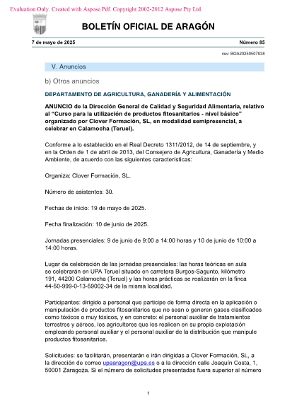 Lugar de celebración de las jornadas presenciales: las horas teóricas en aula se celebrarán en UPA Teruel situado en carretera Burgos-Sagunto, kilómetro 191, 44200 Calamocha (Teruel) y las horas prácticas se realizarán en la finca 44-50-999-0-13-59002-34 de la misma localidad.