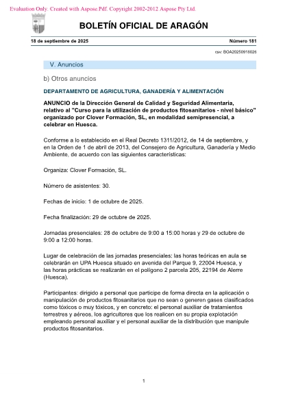 Lugar de celebración de las jornadas presenciales: las horas teóricas en aula se celebrarán en UPA Huesca situado en avenida del Parque 9, 22004 Huesca, y las horas prácticas se realizarán en el polígono 2 parcela 205, 22194 de Alerre (Huesca).
