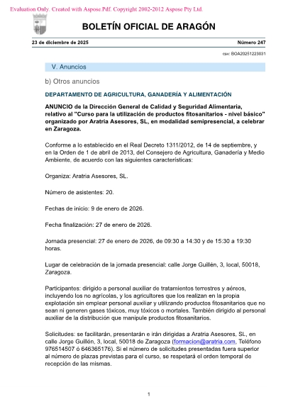 Solicitudes: se facilitarán, presentarán e irán dirigidas a Aratria Asesores, SL, en calle Jorge Guillén, 3, local, 50018 de Zaragoza [email protected]