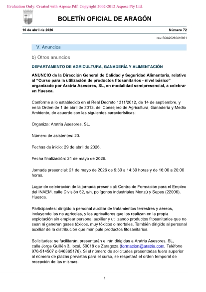 Participantes: dirigido a personal auxiliar de tratamientos terrestres y aéreos, incluyendo los no agrícolas, y los agricultores que los realizan en la propia explotación sin emplear personal auxiliar y utilizando productos fitosanitarios que no sean ni generen gases tóxicos, muy tóxicos o mortales. También dirigido al personal auxiliar de la distribución que manipule productos fitosanitarios.