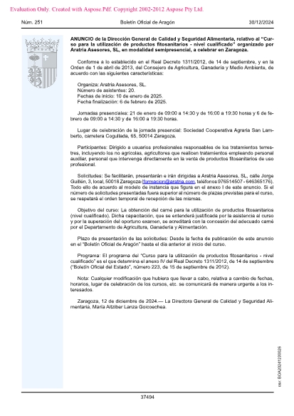 Solicitudes: Se facilitarán, presentarán e irán dirigidas a Aratria Asesores, SL, calle Jorge Guillén, 3, local, 50018 Zaragoza ([email protected], teléfonos 976514507 - 646365176). Todo ello de acuerdo al modelo de instancia que figura en el anexo I de este anuncio. Si el número de solicitudes presentadas fuera superior al número de plazas previstas para el curso, se respetará el orden temporal de recepción de las mismas.