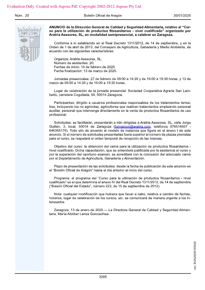 Solicitudes: se facilitarán, presentarán e irán dirigidas a Aratria Asesores, SL, calle Jorge Guillén, 3, local, 50018 de Zaragoza ([email protected], teléfonos 976514507 - 646365176). Todo ello de acuerdo al modelo de instancia que figura en el anexo I de este anuncio. Si el número de solicitudes presentada