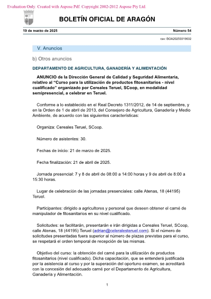 Solicitudes: se facilitarán, presentarán e irán dirigidas a Cereales Teruel, SCoop, calle Atenas, 18 (44195) Teruel ( [email protected]