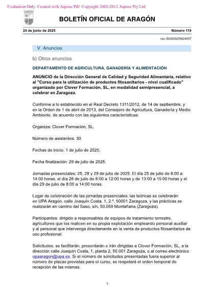 Lugar de celebración de las jornadas presenciales: las teóricas se celebrarán en UPA Aragón, calle Joaquín Costa, 1, 2.º, 50001 Zaragoza, y las prácticas se realizarán en camino del Saso, s/n, 50.059 Montañana (Zaragoza).