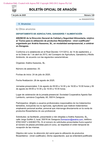 Solicitudes: se facilitarán, presentarán e irán dirigidas a Aratria Asesores, SL, calle Jorge Guillén 3, local, 50018 de Zaragoza [email protected]