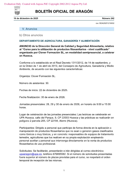 Lugar de celebración de las jornadas presenciales: Las teóricas se celebrarán en UPA Huesca, calle del Parque, 9, CP 22003 Huesca y las prácticas se realizarán en polígono 2 parcela 205, CP 22194, Alerre (Huesca).