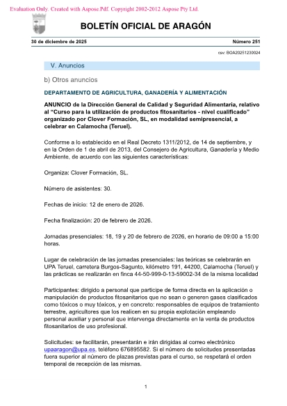 Lugar de celebración de las jornadas presenciales: las teóricas se celebrarán en UPA Teruel, carretera Burgos-Sagunto, kilómetro 191, 44200, Calamocha (Teruel) y las prácticas se realizarán en finca 44-50-999-0-13-59002-34 de la misma localidad