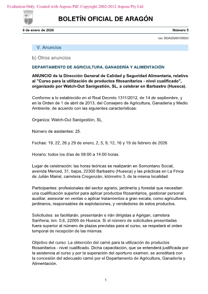 Lugar de celebración: las horas teóricas se realizarán en Somontano Social, avenida Merced, 31, bajos, 22300 Barbastro (Huesca) y las prácticas en La Finca de Julián Mairal, carretera Cregenzán, kilómetro 3, de la misma localidad.