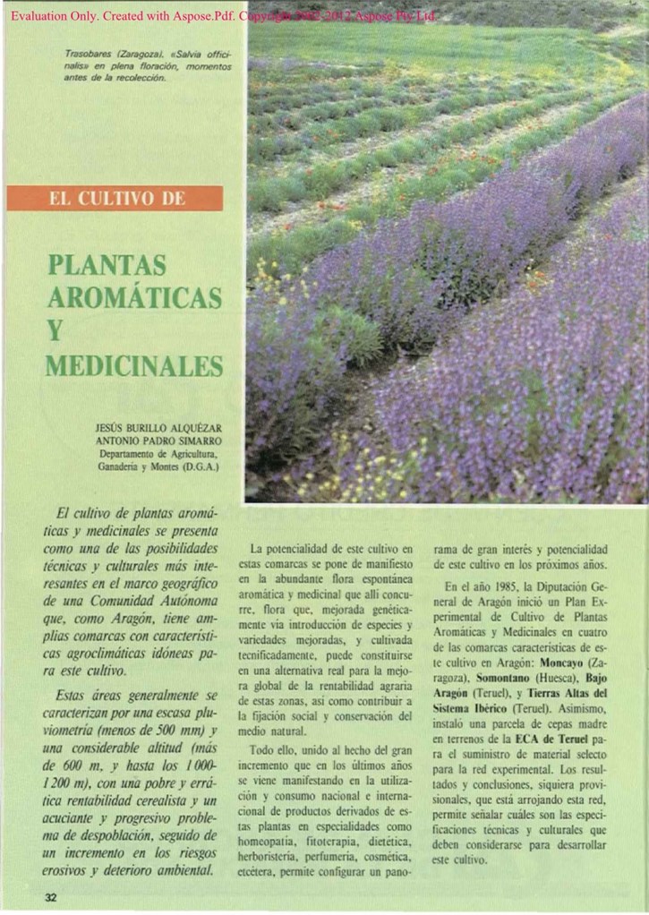 El cultivo de plantas aromáticas y medicinales se presenta como una de las posibilidades técnicas y culturales más interesantes es en el marco geográfico de una Comunidad Aufónoma que, como Aragón, tiene amplias comarcas con características agroclimáticas idóneas para este cullivo.