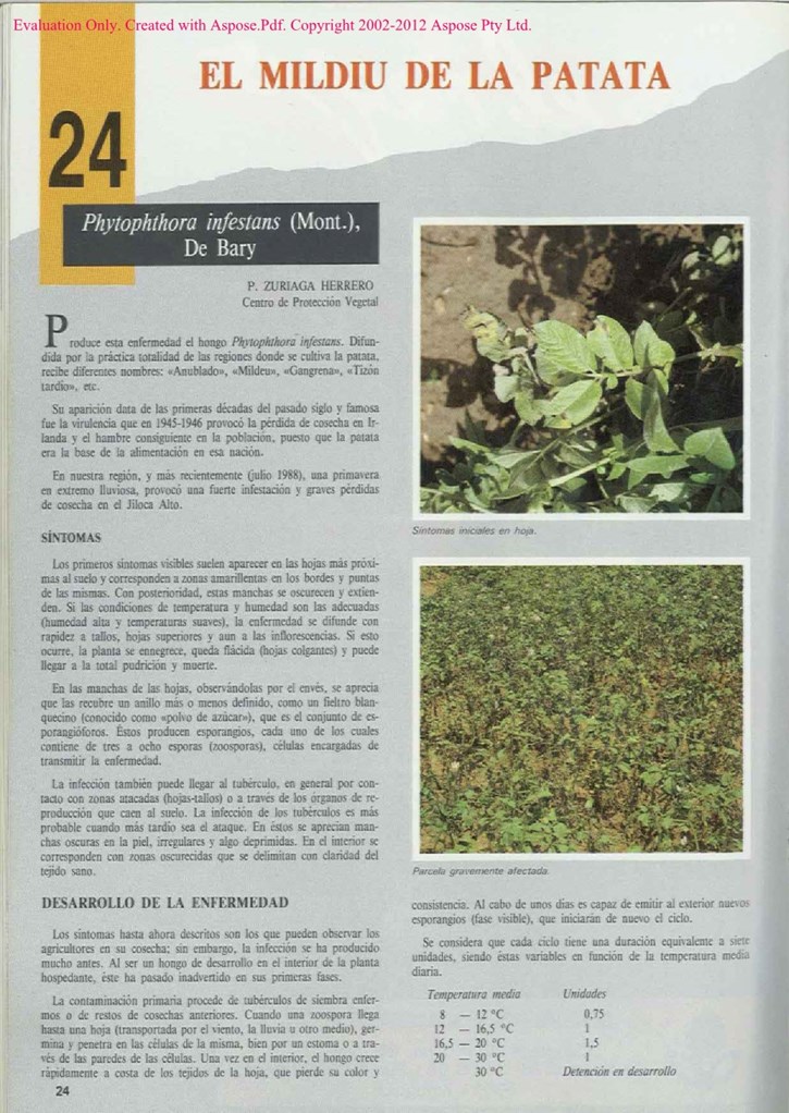 Phytophthora infestans. Síntomas, desarrollo de la enfermedad, daños y medios de lucha.