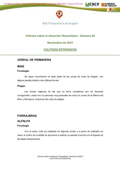 Informe semanal sobre la situación fitosanitaria de los Cultivos Extensivos en Aragón. Semana 44/2021