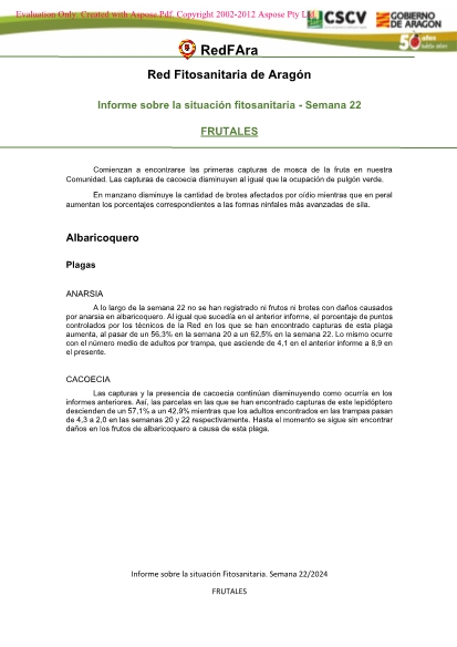 Informe semanal sobre la situación fitosanitaria de los Frutales en Aragón. Semana 22/2024