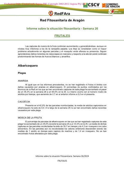 Informe semanal sobre la situación fitosanitaria de los Frutales en Aragón. Semana 26/2024