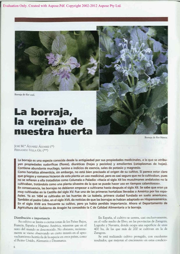 En consecuencia, las borrajas no debieron empezar a cultivarse hasta después el siglo XII. Se sabe que eran ya muy cultivadas en la Castilla del siglo XV. Fue una de las primeras hortalizas llevadas a América por los españoles. Ya en 1494 se cuttivaba en las huertas de La lsabela, primera ciudad fundada en suelo americano. También el padre Cabo. en el siglo XVII, da notidas de que las borrajas se habían adaptado en Hispanoamérica. En el siglo XVIII era freruente su cultivo. pero ya había perdido importancia. Ahora el Departamento de Agricultura del Gobiemo de Aragón ha concedido la C de Calidad Alimentaria a la borraja.