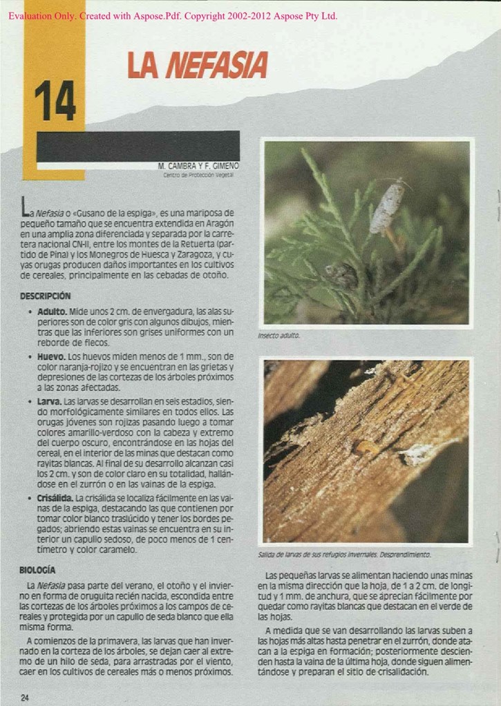 La nefasia o "Gusano de la espiga", es una mariposa de pequeño tamaño que se encuentra extendida en Aragón en una amplia zona diferendada y separada por la carretera N-II, entre los montes de la Retuerta (partido de Pina) y los Monegros de Huesea y Zaragoza, y cuyas orugas producen daños importantes en los cultivos de cereales, principalmente en las cebadas de otoño.