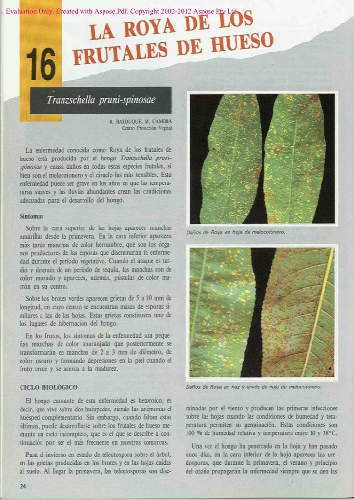 La enfermedad conocida como Roya de los frutales de hueso está producida por el hongo Tranzschella prunispinosae y causa daños en todas estas especies frutales, si bien son el melocotonero y el ciruelo las más sensibles. Esta enfermedad puede ser grave en los años en que las temperaturas suaves y las lluvias abundantes crean las condiciones adecuadas para el desarrollo del hongo.