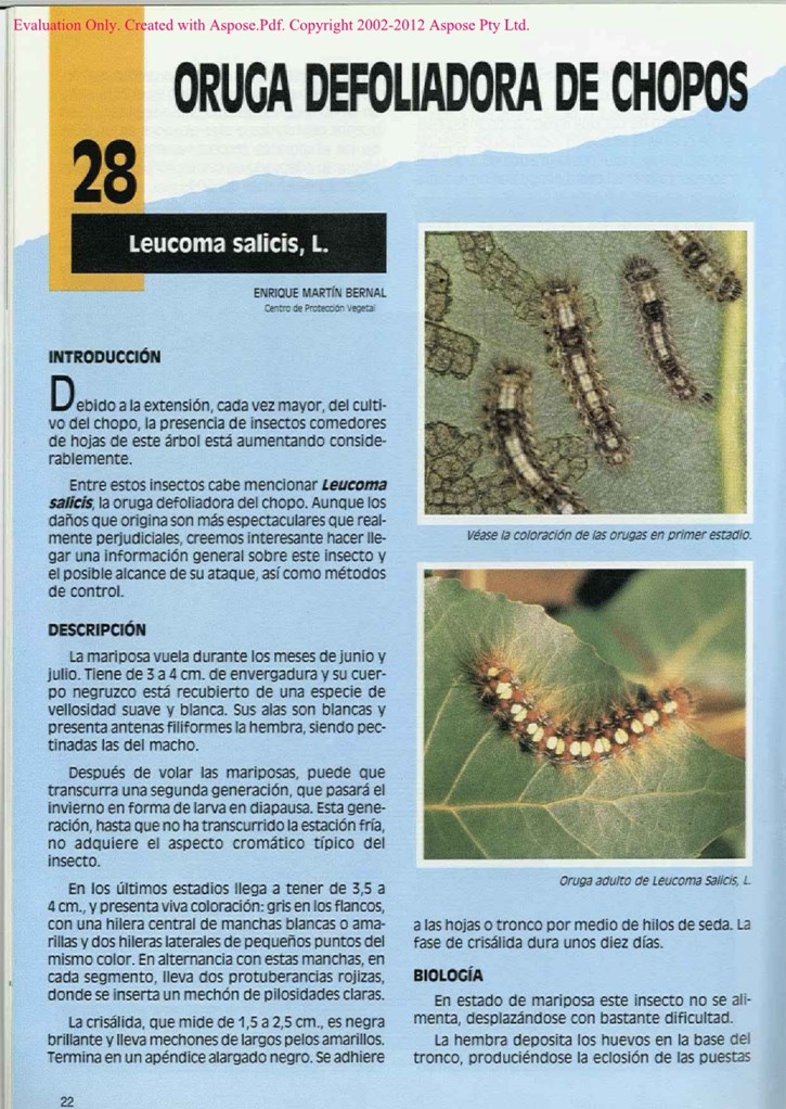 Entre estos insectos cabe mencionar Leucoma salieis, la oruga defoliadora del chopo. Aunque los daños que origina son más espectaculares que realmente perjudiciales, creemos interesante hacer llegar una información general sobre este insecto y el posible alcance de su ataque, así como métodos de control.
