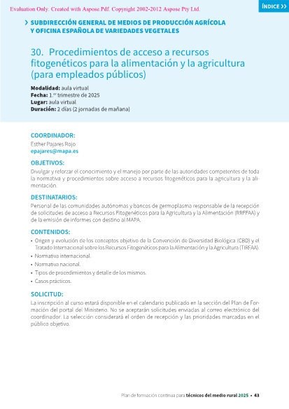 Curso práctico dirigido principalmente a los proveedores de recursos fitogenéticos para la agricultura y la alimentación: empleados públicos gestores de bancos de germoplasma y autoridades competentes de Comunidades Autónomas. También a empresas, en particular de mejora e innovación vegetal, que puedan actuar como proveedoras y reciban solicitudes de acceso a recursos incluidos en el ámbito de aplicación del Real Decreto 429/2020, de 3 de marzo.