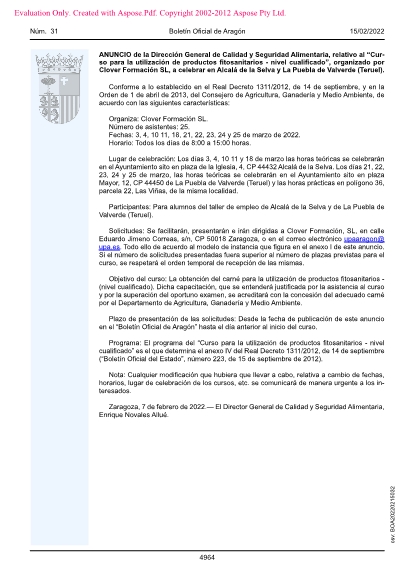 Lugar de celebración: Los días 3, 4, 10 11 y 18 de marzo las horas teóricas se celebrarán en el Ayuntamiento sito en plaza de la Iglesia, 4, CP 44432 Alcalá de la Selva. Los días 21, 22, 23, 24 y 25 de marzo, las horas teóricas se celebrarán en el Ayuntamiento sito en plaza Mayor, 12, CP 44450 de La Puebla de Valverde (Teruel) y las horas prácticas en polígono 36, parcela 22, Las Viñas, de la misma localidad.